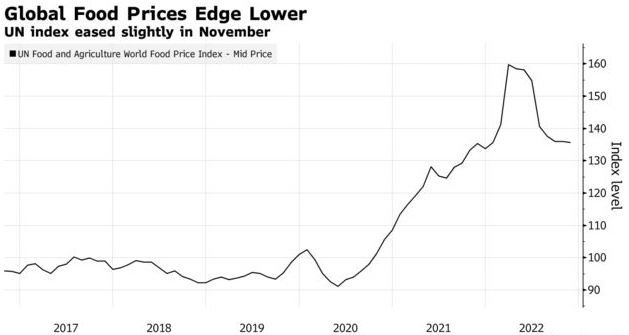 智通财经APP获悉,联合国粮食及农业组织(FAO)的粮食世界价格指数11月份小幅下降,这是自3月份俄乌战争后创下的历史新高以来连续第八个月下降,显示通胀压力可能正在缓解。FAO周五表示,11月份粮农组织追踪全球交易最多的粮食大宗商品的价格指数平均为135.7点,为今年1月份以来最低水平,低于10月份的135.9点。FAO还将其对2022年全球谷物产量的预测从上个月的27.64亿吨下调至27.56亿吨。