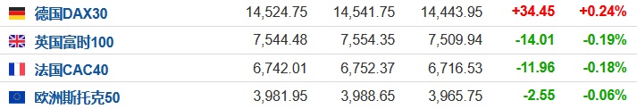 2. 截至发稿,德国DAX指数涨0.24%,英国富时100指数跌0.19%,法国CAC40指数跌0.18%,欧洲斯托克50指数跌0.06%。