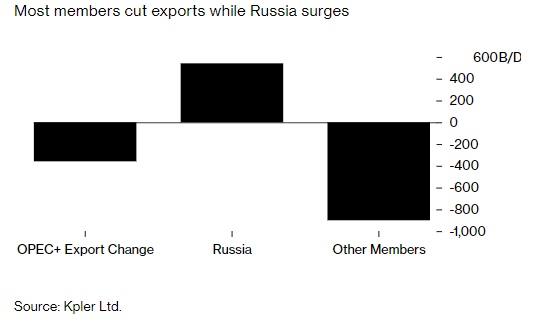 智通财经APP获悉,欧佩克在11月将每日石油产量削减了100万桶,但与此同时,俄罗斯的石油出口量却激增,部分抵消了该组织出口量的下降。能源分析公司Kpler的数据显示,包括俄罗斯在内的欧佩克+的总体石油出口量每天仅下降36.1万桶。