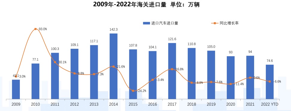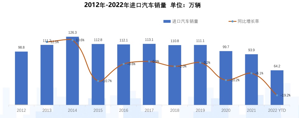 从需求端来看,近年来,进口车终端需求保持相对稳定,受疫情和芯片短期冲击,2020-2022年进口汽车市场出现下滑,2022年1-10月销售64.2万辆,同比下降19.2%,其中10月同比上升0.1%,是2022年首个实现正增长的月度。