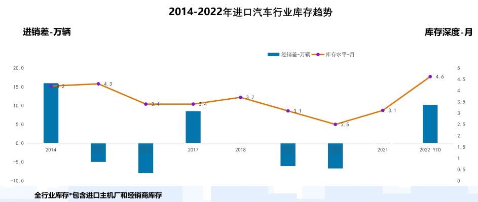 库存上看,伴随着19-20年供给小于需求,进口汽车全行业库存深度出现明显下滑;2021年供需基本平衡,但销量有所下滑;截至2022年10月库存深度攀升到4.6个月,创历史新高。