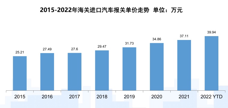 价格方面,进口汽车报关单价逐年提升,从 2015年到 2022年,进口汽车报关单价从 25.21万元提升到 39.94万元,一是消费升级趋势,二是低价产品国产化趋势,三是汇率近期有所贬值。