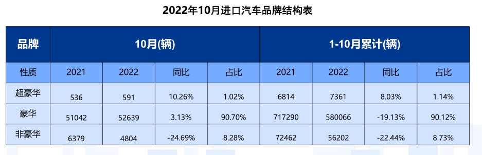 从品牌结构上看,受疫情的影响,进口汽车市场整体大幅下滑,但超豪华车更加受到消费者的追捧,超豪华汽车本月同比增长 10.26%,大幅提升。从 1-10月累计来看,豪华仍然是销量主力,占比超过 90%以上,非豪华销量下滑 22.4%。