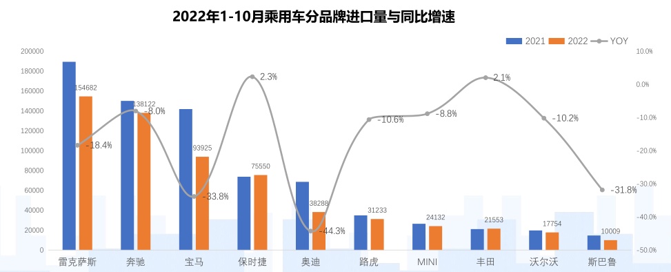 2022年1-10月,前十大品牌中保时捷、丰田均实现正增长;排名第一的雷克萨斯销量超过15万辆,但同比下降18.4%,奔驰车型销售突破13万辆,同比下降8.0%,车型国产导致宝马、奥迪销量分别下滑33.8%和44.3%。