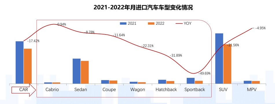 车型结构上,2022年1-10月,三大车型均出现不同程度的下滑,MPV降幅最低,同比下滑4.95%,轿车和SUV降幅分别收窄17.42和21.56个百分点。轿车中的小众车型表现分化,Sportback、hatchback车型同比降幅远大于整体市场,而Cabrio则仅小幅下滑0.94%。
