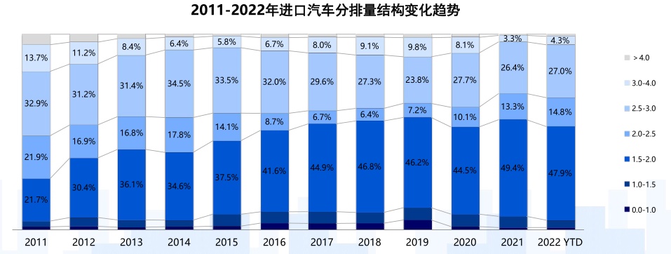 排量方面有所下移,1.5-2.0L排量区间占比为47.9%,相比2021年有所下滑,但仍保持第一大排量区间;2.5-3.0L排量区间相比2021年提升0.6个百分点,是第二大排量区间;平行进口车型逐步恢复供应,3.0L以上排量份额反弹至5.4%,提升1.5个百分点。
