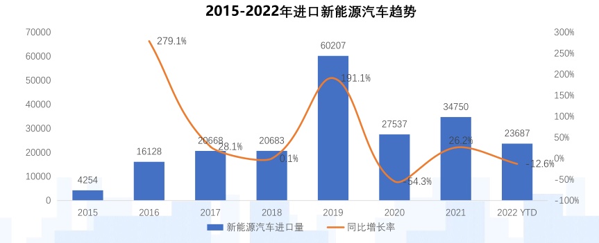 进口新能源汽车销售波动,2022年1-10月份数据NEV销售23687辆,同比下滑12.6%,10月销售2250辆,同比下降26.54%,其中纯电车型销售不足600辆,同比下降35.1%。2016-2018年进口新能源汽车销售在1.5-2.0万辆之间,在Model 3的带动下,2019年进口新能源汽车销售暴增至6万辆,同比增长191%,占进口汽车总量的5.4%;随着车型国产,2020年销售规模回落至2.75万辆,随着PHEV的贡献,2021年销售同比增长26.2%。