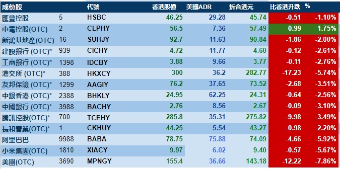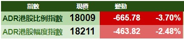 智通财经APP获悉,周五美股三大指数涨跌不一,港股ADR指数下跌,按比例计算,收报18009点,较香港收市跌665.78点或3.70%。