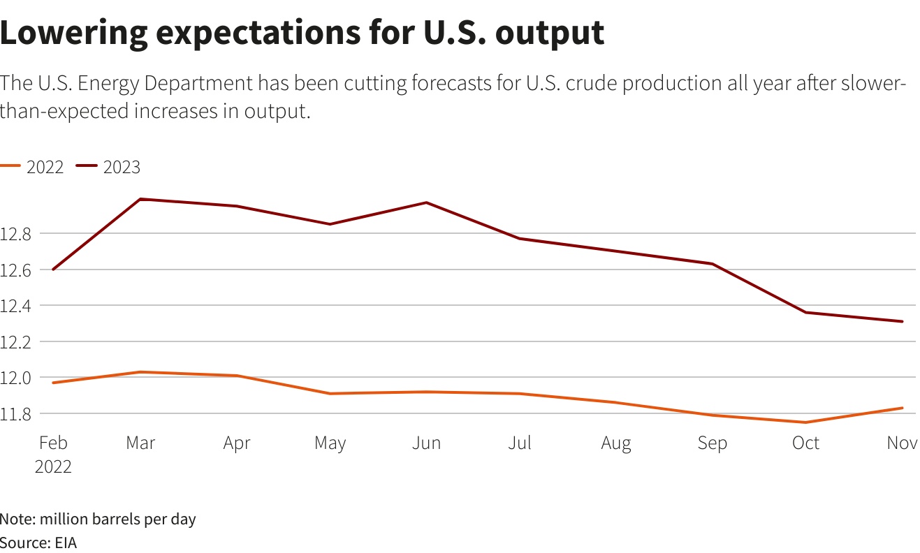 美国政府预计整体石油产量将在明年达到一个新的峰值,但今年以来已多次下调了预期。美国预计,2023年石油产量将增加约48万桶/日至1231万桶/日,为连续第五次向下修正,低于早先估计的创纪录的1236万桶/日。这意味着,与今年仅50万桶/日的增幅相比,明年的产量增幅将会更小,而且这一产量增幅远低于今年春季约90万桶/日的高预期。