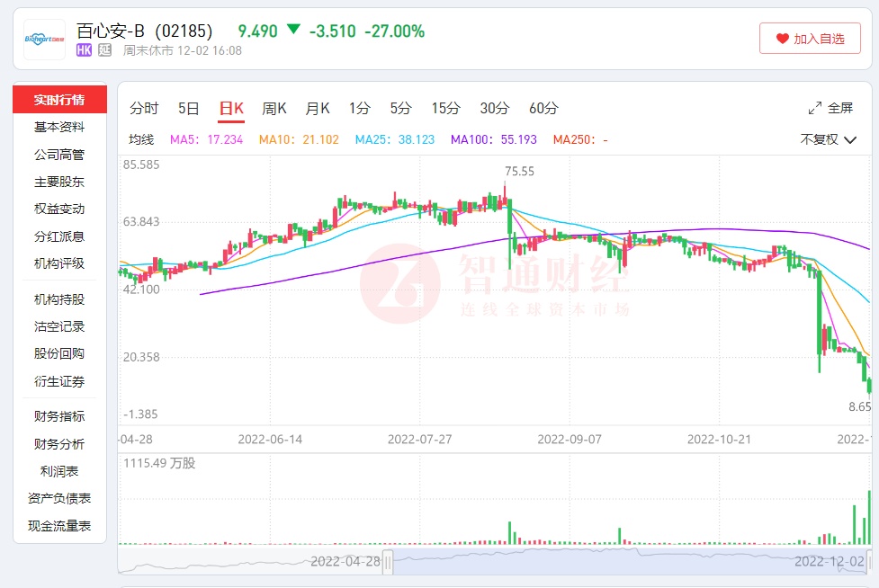 12月3日,百心安-B(02185)股价盘中突变,由红转绿再至大跌33%,最终收跌27%。而在此之前,其股价还分别与11月18日、12月1日录得约55%、30%的较大跌幅。拉长时间线来看,11月份以来,其股价已经累跌超80%。