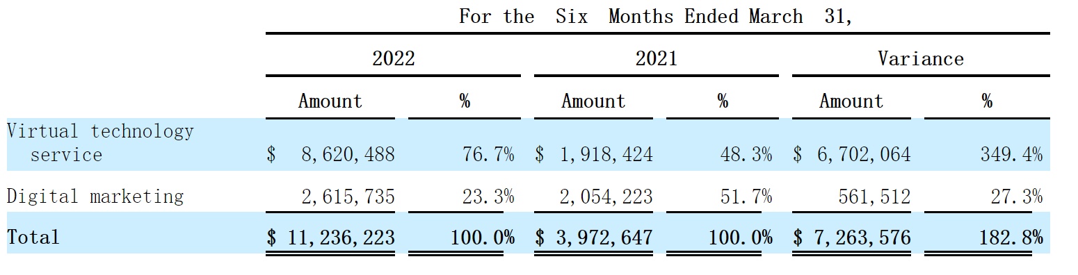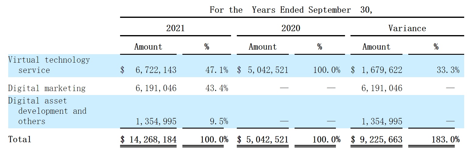 从业绩来看,环球墨菲实现了快速成长。2020财年(截至9月30日止12个月)时的收入为504.25万美元,至2021财年时,得益于虚拟技术服务收入增长33.3%以及数字营销、数字资产开发两大业务新推出后录得收入,因此2021财年的收入增长183%至1426.82万美元。