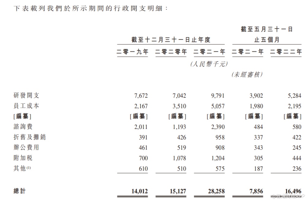 在费用端,行政开支为濠暻科技占比最大的一项期间费用,公司行政开支包括研发开支、员工成本、咨询费等等。2019年至2021年,公司行政开支金额分别达到1401.2万元、1512.7万元和2825.8万元,其中2021年行政开支同比增长86.8%。2022年前5个月,公司行政开支达到1649.6万元,同比增长110%。