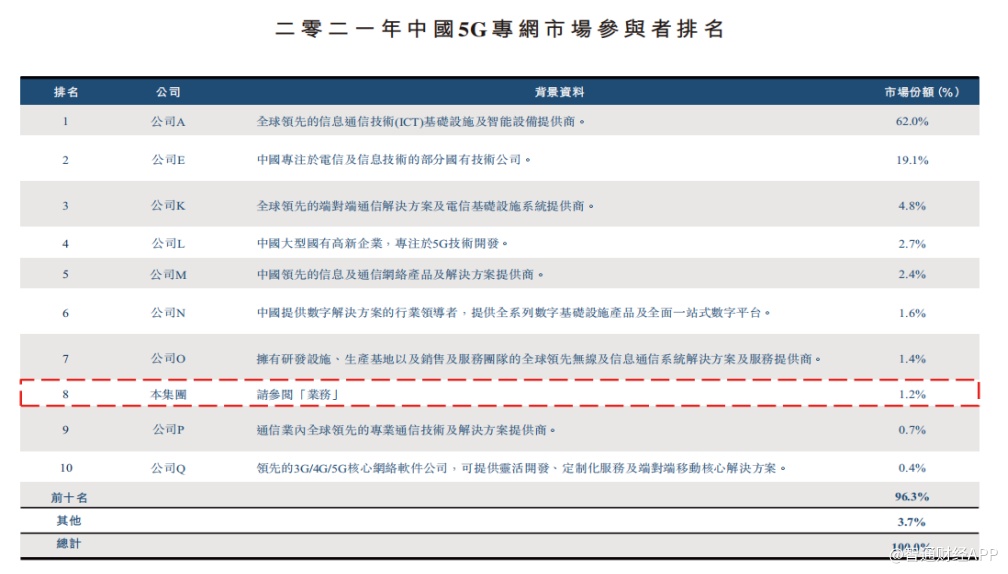 中国5G专网市场则由少数领导者牢牢把握市场份额。于2021年,中国5G专网市场参与者仅有约20名,前十名参与者的总收益占中国5G专网市场总收益约96.3%,最大参与者的市场份额为62%。濠暻科技排名第八,市场占有率仅1.2%。