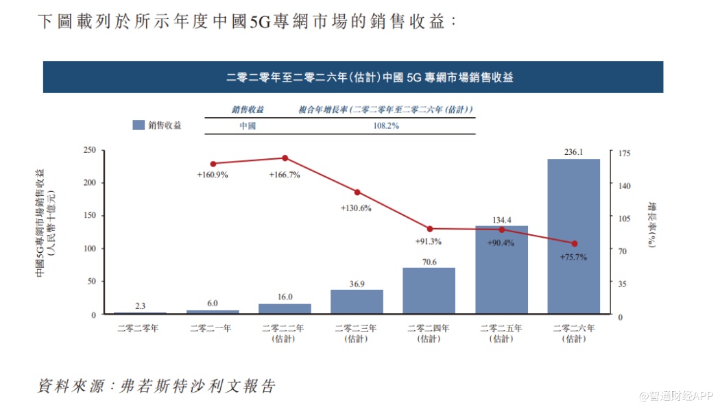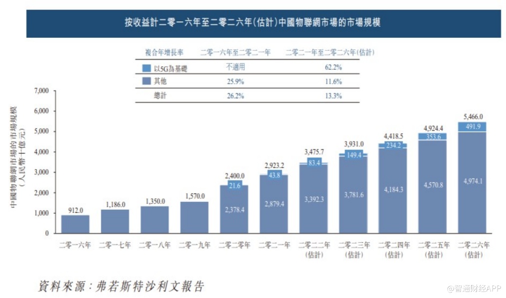 与此同时,5G专网解决方案市场同样具备高成长潜力。2020年,中国5G专网市场的总收益为23亿元。于2021年,5G专网市场占中国物联网市场约0.2%,总收益为60亿元。随着各行业数字化转型加快,中国5G专网市场的总收益预计于2026年将达到2,361亿元,2021年至2026年的的复合年增长率为108.2%。