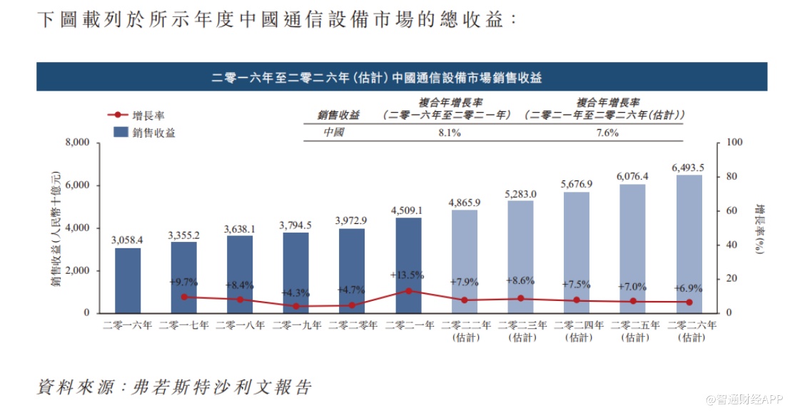 此外,通信设备市场也将保持稳定增长。弗若斯特沙利文报告显示,中国通信设备市场的市场规模由2016年的30,584亿元增加至2021年的45,091亿元,复合年增长率为8.1%,预计将于2026年达人民币64,935亿元,2021年至2026年复合年增长率为7.6%。