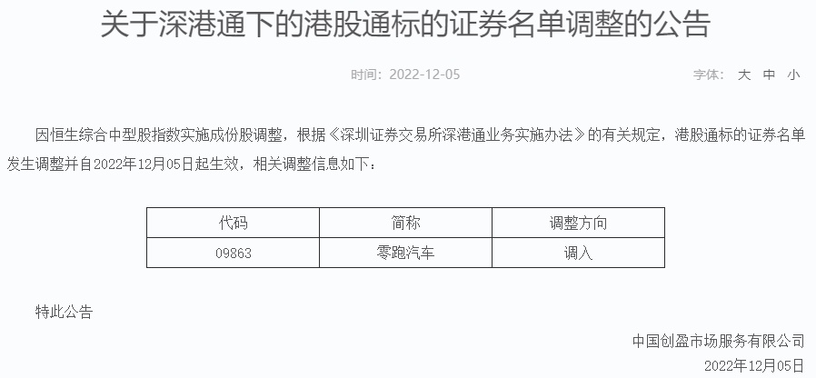 智通财经APP获悉,12月5日,深交所发布公告称,因恒生综合中型股指数实施成份股调整,根据《深圳证券交易所深港通业务实施办法》的有关规定,港股通标的证券名单发生调整,零跑汽车(09863)调入港股通股票名单并自今日起生效。
