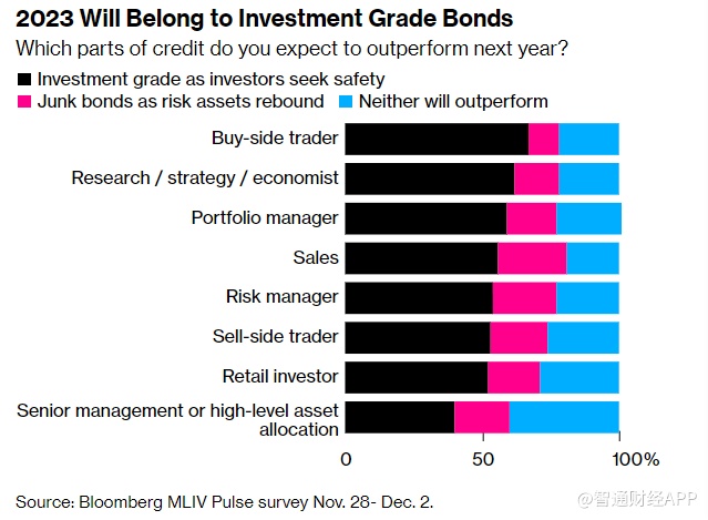随着一些投资者对杠杆贷款越来越不感兴趣,投资级债券正蓄势待发。超过一半的受访者表示,他们预计投资级债券明年的表现会好于预期,而约五分之一的受访者表示,他们预计垃圾级债券的表现会更好。较长期的高评级债券在11月份创造了超过9%的回报率,是2008年以来表现最好的一个月。