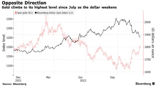 今年以来,金价变化一直受到美联储鹰派激进加息的冲击,而最近市场有迹象表明美联储将在未来放缓加息步伐,进而提振了黄金价格反弹,上周涨至每盎司1800美元以上。