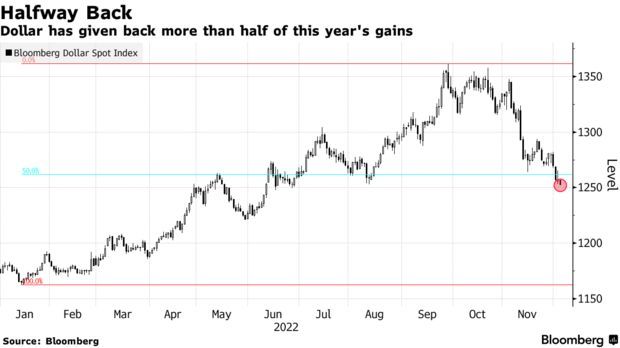 智通财经APP获悉,随着市场对美联储将放缓加息步伐的预期日益升温、以及对中国防疫措施调整的乐观情绪,美元已回吐了今年以来一半以上的涨幅。数据显示,美元现货指数目前的涨幅已收窄至7%左右,该指数此前一度涨约16%。