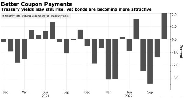智通财经APP获悉,尽管美联储还远未宣布在对抗通胀的战争中取得胜利,但华尔街正在寻找一个继续投资债券市场的理由。今年前10个月的抛售使投资者蒙受了创纪录的损失,同时也将美国国债收益率推高至逾10年来的最高水平,为美国国债利息支付处于谷底的时代画上了句号。