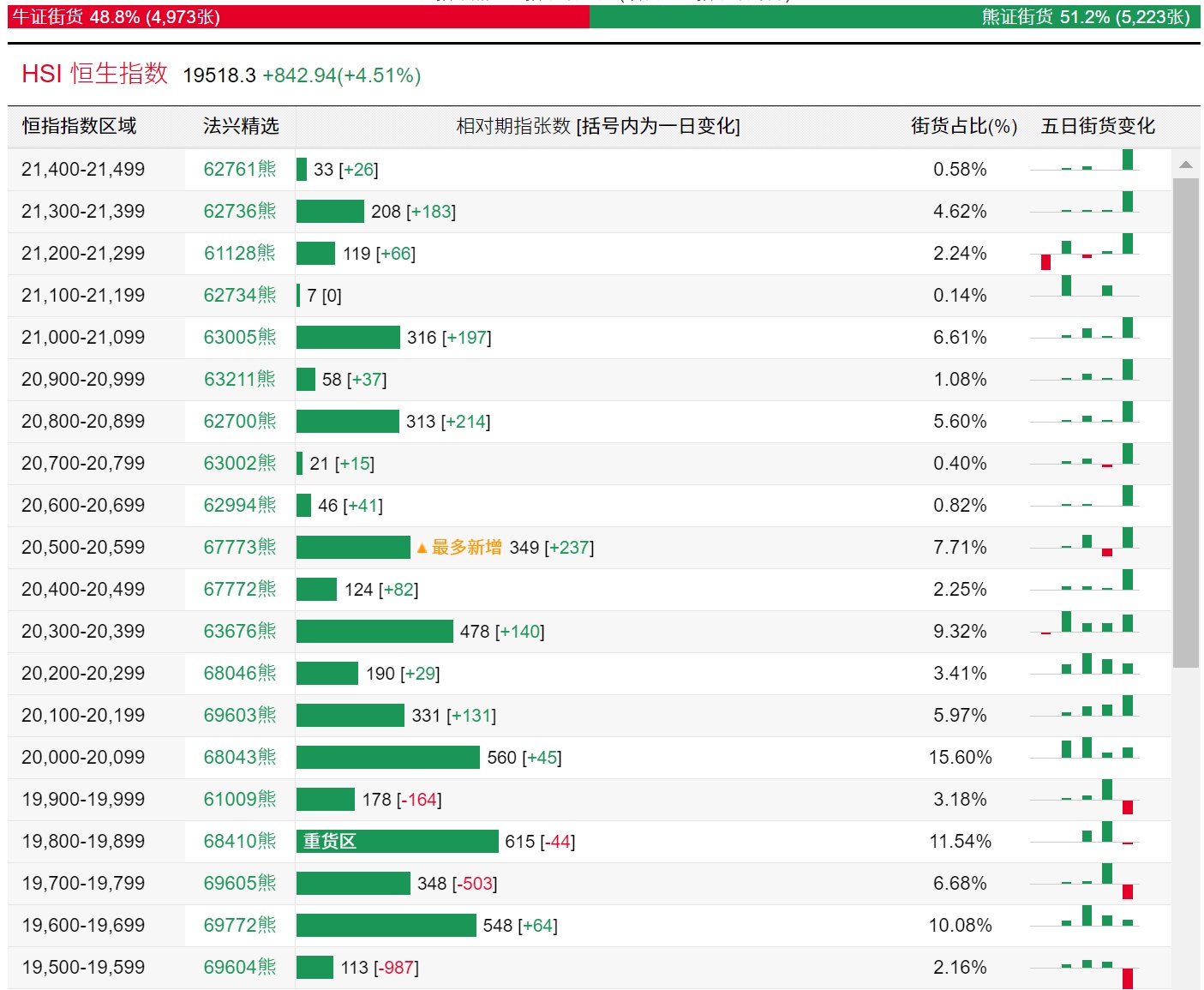法兴恒指牛熊证街货分布图中的数据显示,熊证街货重货区在19800-19899区间,该区间最新熊证数量为615张,较上一交易日减少44张;最多新增在20500-20599区间,该区间最新熊证数量为349张,较上一交易日增加237张。