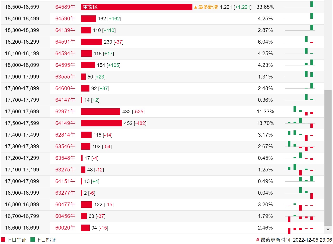 牛证街货重货区和最多新增都在18500-18599区间,该区间最新牛证数量为1221张,较上一交易日增加1221张。