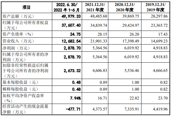 财务方面,于2019年度、2020年度、2021年度以及2022年6月30日止,公司实现营业收入分别约为1.47亿元、1.74亿元、2.19亿元、1.27亿元。公司实现归属于母公司所有者的净利润分别为4918.83万元、6019.92万元、5364.56万元、2878.7万元。