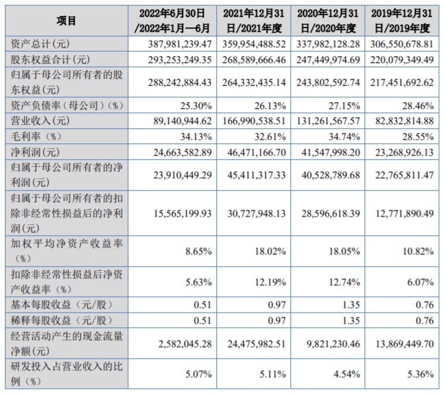 财务方面,于2019年度、2020年度、2021年度以及2022年6月30日止,公司实现的营业收入分别约为8283.28万元、1.31亿元、1.67亿元、8914.10万元;实现的净利润分别约为2326.89万元、4154.80万元、4647.12万元、2466.36万元。