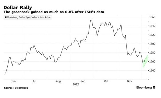 美元现货指数上涨0.8%,结束了连续四天的下跌,此前美国供应管理协会公布的11月份服务业指数意外上升。美元的普遍上涨,压低了10国集团(g20)所有成员国货币的汇率,其中日元表现最差,原因是美国国债走高,以及新建立的投机性多头头寸减少。欧元回吐了稍早的涨幅,因实际货币买盘限制了跌幅。