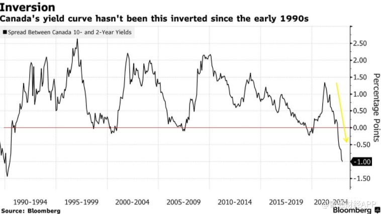 智通财经APP获悉,当地时间周一,加拿大基准两年期国债收益率较10年期国债收益率高出100个基点,创自20世纪90年代初以来的最大倒挂幅度,当时该国经济正陷入深度衰退。值得关注的是,加拿大央行将于北京时间12月7日(周三)23:00公布利率决议,市场预期加拿大央行将再次加息50个基点至4.25%。