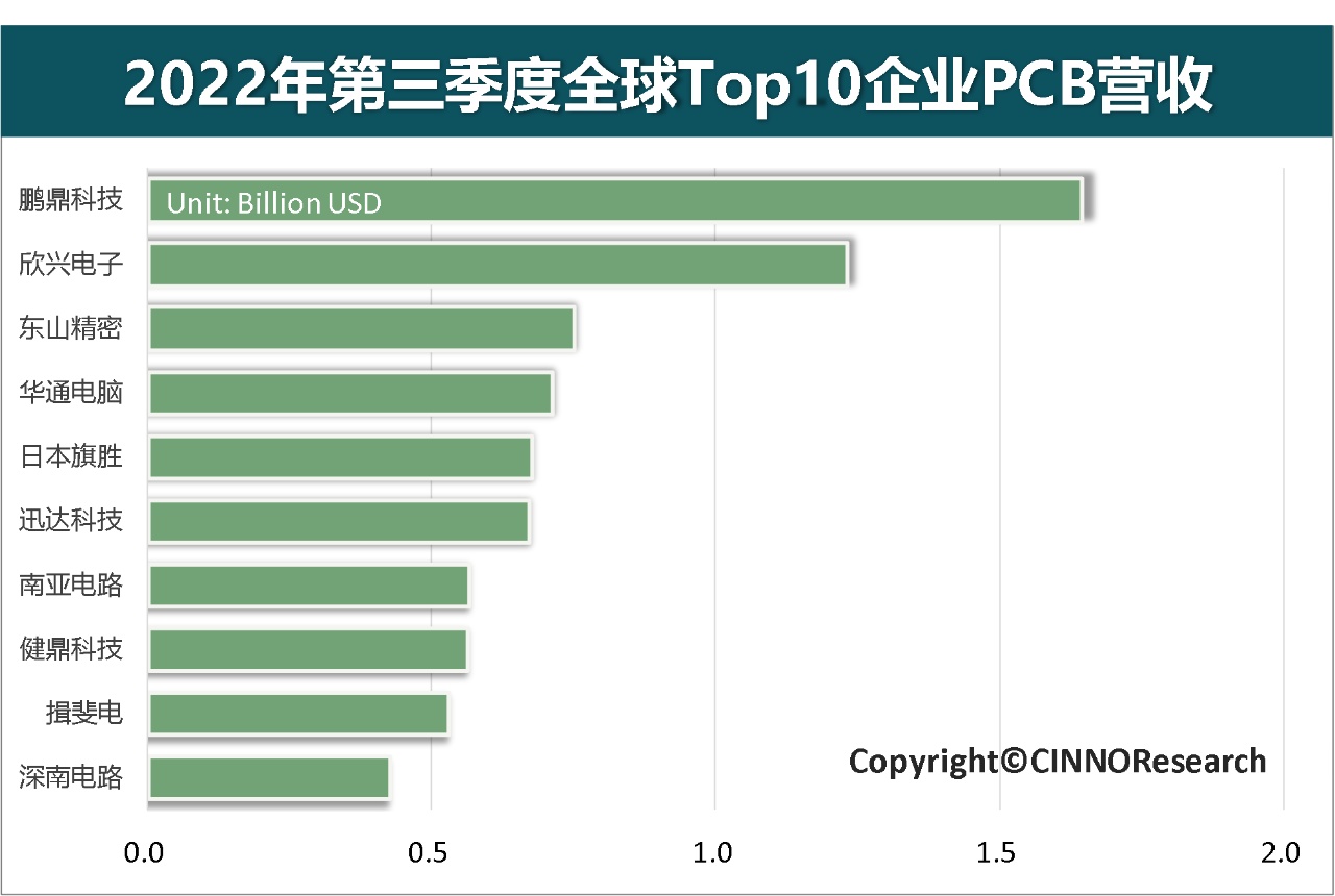 南亚电路在本次Top10榜单中依然是PCB产品毛利率最高的企业,2022年第三季度其营收按本币计算同比增长约21.8%,环比增长约13.2%,也是本次Top10榜单中唯一PCB产品毛利率超过40%的企业。