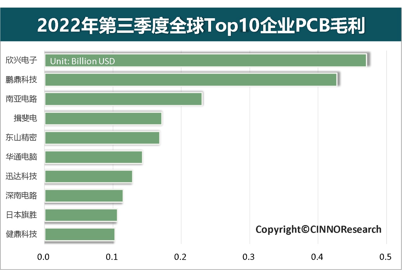 欣兴电子在本次Top10榜单中PCB产品营收同比增长依然最快,2022年第三季度其营收按本币计算同比增长约33.1%,环比增长约5.1%,稳坐Top10榜单第二。受益于IC载板需求的大幅增长,欣兴电子2022年前三季度IC载板出货额按本币计算同比大幅增长约74%。同时,欣兴电子是全球毛利唯一超过10亿美元的PCB企业。