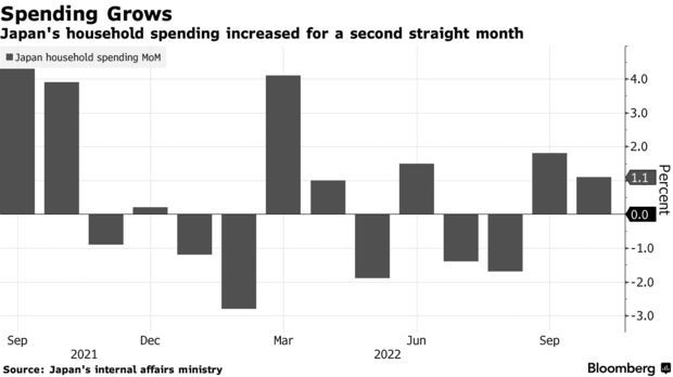 智通财经APP获悉,尽管通胀加速以及实际工资下降,但日本家庭支出在10月份连续第二个月增加。日本内务省周二公布的数据显示,得益于服装和娱乐支出的增长,日本10月所有家庭支出同比增长1.2%,环比增长1.1%。