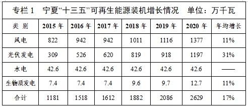 1.发展规模持续扩大。宁夏风电基地、光伏园区项目建设有序推进,风电、光伏发电实现了“规模化、集约化、园区化”快速发展,装机规模均突破千万千瓦。吴忠市垃圾发电、银川市垃圾发电(二期)、石嘴山市生物质热电联产等项目建成投运,生物质发电规模稳步增长。水电项目运行平稳。截至2020年底,全区可再生能源电力装机和发电量达到2629万千瓦和355亿千瓦时,分别比2015年增长123%和156%。可再生能源电力装机、发电量占比分别由2015年的37%、12%增长至44%、20%。可再生能源已逐渐成为全区新增电力装机主力,清洁能源替代作用日益突显。
