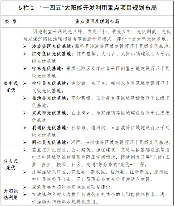 1.加快推进集中式光伏电站建设。整合沿黄地区和中部干旱带土地资源,推动沙漠、戈壁、荒漠、采煤沉陷区大型集中式光伏开发,因地制宜建设各类“光伏+生态”立体开发综合利用示范项目,实现土地资源集约高效利用,促进光伏发电与生态环境保护协调发展。充分发挥平价光伏市场竞争力,重点在沙坡头区、红寺堡区、宁东能源化工基地、中宁县、盐池县、灵武市、利通区、同心县、青铜峡市等地规划建设一批百万千瓦级光伏基地。充分发挥风、光资源多能互补优势,鼓励利用风电场空闲土地建设风光互补电站。到2025年,集中式光伏发电装机达到3250万千瓦以上。