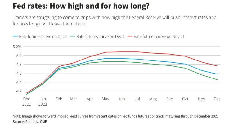 上周五公布的一份报告显示,美国11月非农就业人数大超预期,与美国短期利率挂钩的期货合约反映市场押注美联储明年将继续加息,最终在明年5月份达到略低于或略高于5%的水平。但同样根据这些期货合约显示,市场预期明年5月过后美联储可能会转向降息,到2023年底前将利率降至4.25%-4.50%区间。
