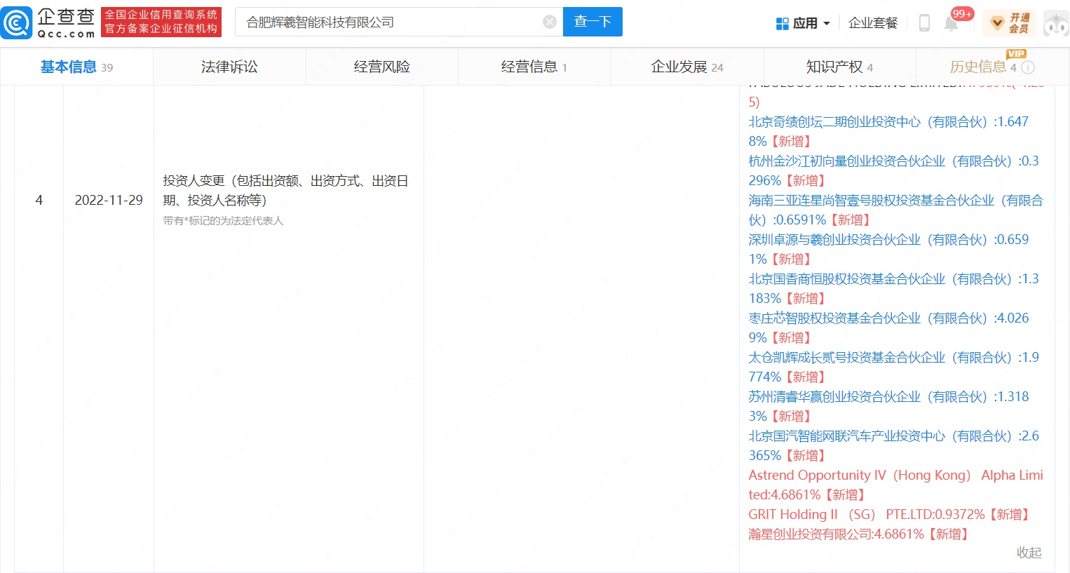 LIMITED、北京国汽智能网联汽车产业投资中心(有限合伙)等,投资总额由1375万人民币增至约1956万人民币,增幅约42%。
