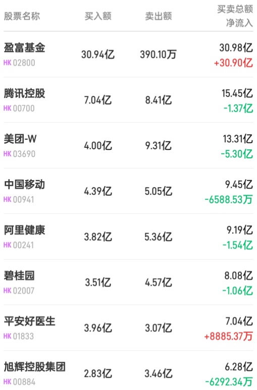 此外,盈富基金(02800)、药明生物(02269)分别获净买入36.75亿、1603万港元。而中国移动(00941)遭净卖出6588万港元。
