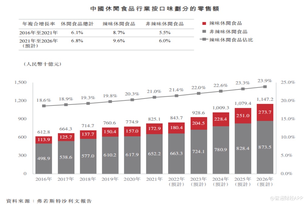 根据弗若斯特沙利文报告,按零售额计算,2021年中国休闲食品行业的市场规模为8,251亿元,2016年至2021年年复合增长率为6.1%。受可支配收入增长、城镇化进程加快、消费场景日益丰富、现有产品持续升级及新产品推出以及销售渠道不断改善等因素的推动,预计2021年至2026年中国休闲食品行业市场规模将以6.8%的年复合增长率增长,按零售额计算,到2026年将达到11,472亿元。其中,预计中国辣味休闲食品行业2021年至2026年的零售额将以9.6%的年复合增长率增长,从2021年的1,729亿元增长至2026年的2,737亿元。