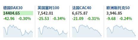 2. 截至发稿,德国DAX指数跌0.30%,英国富时100指数跌0.34%,法国CAC40指数跌0.31%,欧洲斯托克50指数跌0.24%。