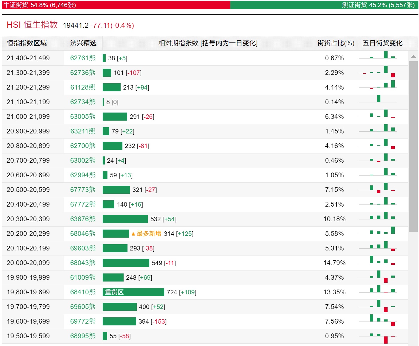 法兴恒指牛熊证街货分布图中的数据显示,熊证街货重货区在19800-19899区间,该区间最新熊证数量为724张,较上一交易日增加109张;最多新增在20200-20299区间,该区间最新熊证数量为314张,较上一交易日增加125张。