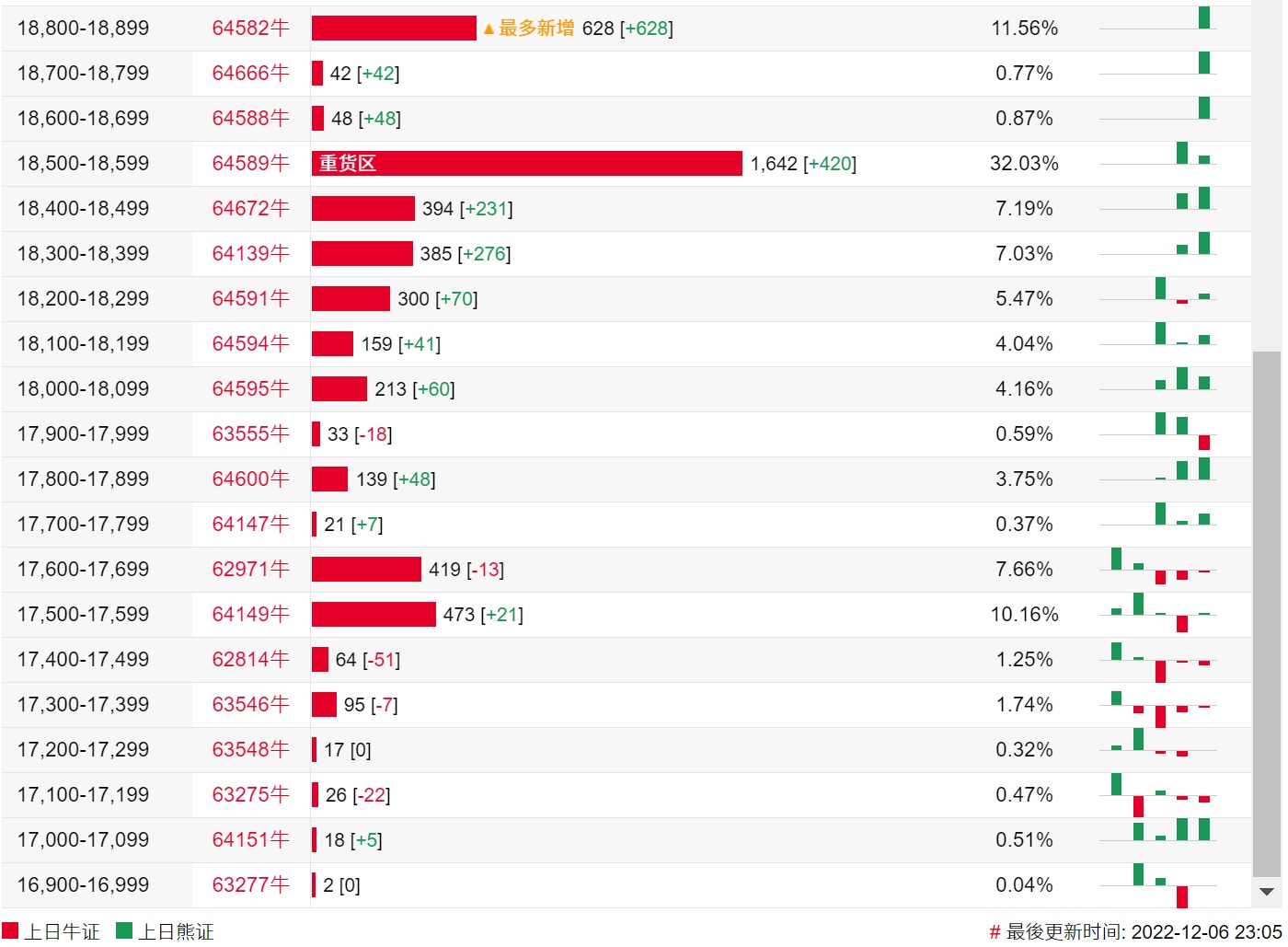 牛证街货重货区在18500-18599区间,该区间最新牛证数量为1642张,较上一交易日增加420张;最多新增在18800-18899区间,该区间最新牛证数量为628张,较上一交易日增加628张。