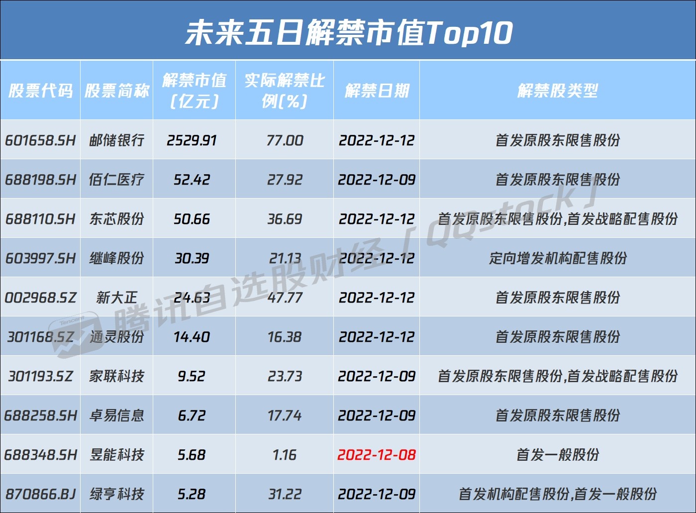 从解禁比例来看,未来5日邮储银行解禁比例达77%,其次解禁比例居前的分别为新大正、恒立钻具;从解禁市值来看,邮储银行、佰仁医疗等股解禁市值居前。