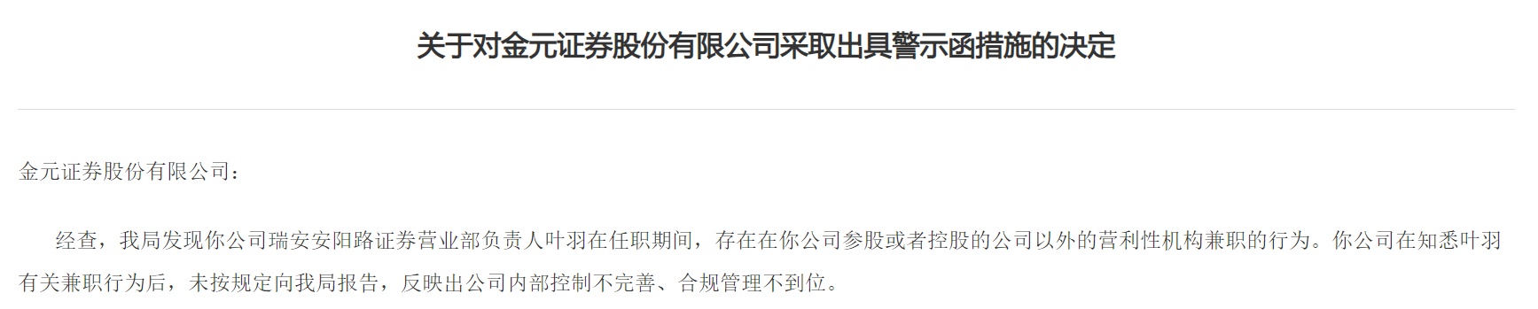 浙江证监局对金元证券出具警示函,公告显示,金元证券瑞安安阳路证券营业部负责人叶羽在任职期间,存在在公司参股或者控股的公司以外的营利性机构兼职的行为。公司在知悉叶羽有关兼职行为后,未按规定向证监局报告,反映出公司内部控制不完善、合规管理不到位。