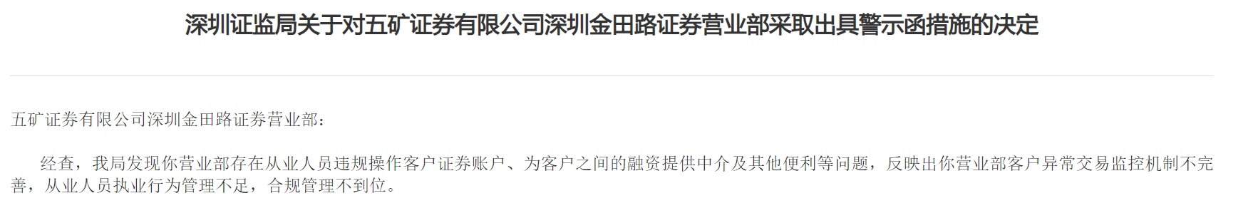 其中,深圳证监局发现五矿证券营业部存在从业人员违规操作客户证券账户、为客户之间的融资提供中介及其他便利等问题,反映出公司营业部客户异常交易监控机制不完善,从业人员执业行为管理不足,合规管理不到位。
