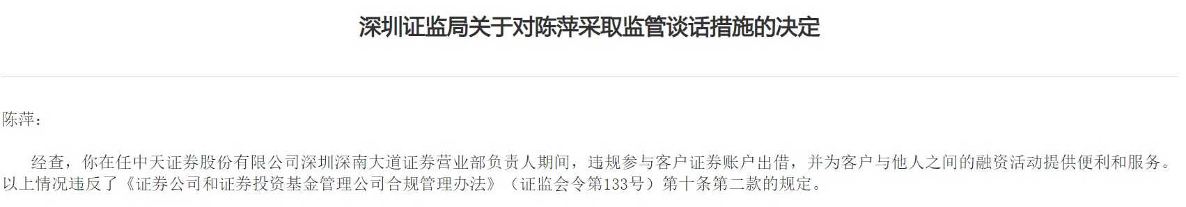 陈萍在任中天证券股份有限公司深圳深南大道证券营业部负责人期间,违规参与客户证券账户出借,并为客户与他人之间的融资活动提供便利和服务。