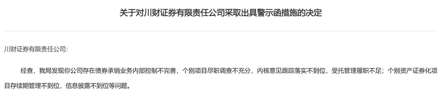 四川证监局对川财证券出具警示函。经查,四川证监局发现川财证券存在债券承销业务内部控制不完善,个别项目尽职调查不充分,内核意见跟踪落实不到位,受托管理履职不足;个别资产证券化项目存续期管理不到位,信息披露不到位等问题。