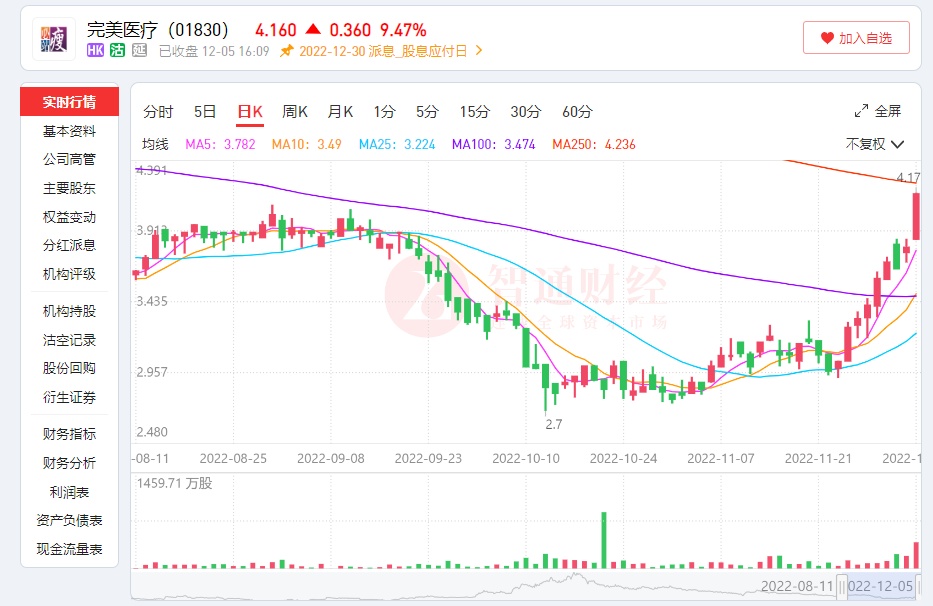 12月5日,完美医疗公布,公司主席、行政总裁兼执行董事欧阳江自2022年11月28日个人增持750万股股份后,欧阳江于2022年11月28日及2022年12月2日在公开市场以平均价每股股份3.69港元再度购买合共100万股股份。