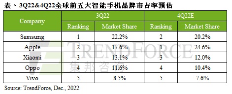 第三季列居第三至第五名的分别是小米(01810)(Xiaomi;含Redmi, POCO, Black Shark)、OPPO(含Realme, OnePlus)、Vivo(含iQoo),仅小米产量与第二季持平,其他两家业者均呈现环比衰减。而三家业者下半年生产表现皆受限于库存修正、疫情、印度市场经济成长放缓,预估第四季产量将与第三季大致持平。此外,目前三大品牌主力市场之一的中国已达高度饱和,同时Honor在中国的市占持续壮大,直接威胁小米、OPPO、Vivo后续市占率,故未来三大品牌的成长重心主要以持平国内市占,并进海外市场拓展为主。