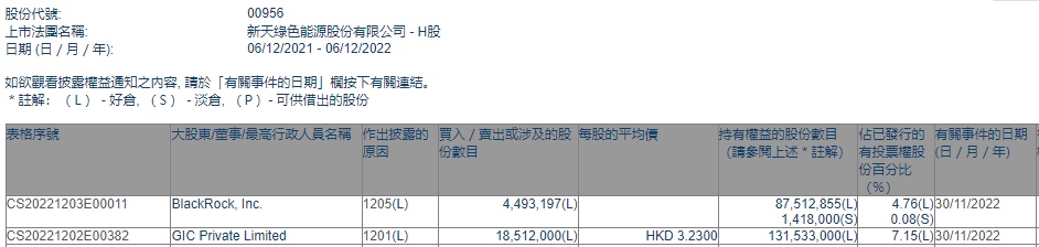 智通财经APP获悉,香港联交所最新资料显示,11月30日,GIC Private Limited减持新天绿色能源(00956)1851.20万股,每股作价3.23港元,总金额约为5979.38万港元。减持后最新持股数目约为1.32亿股,最新持股比例为7.15%。